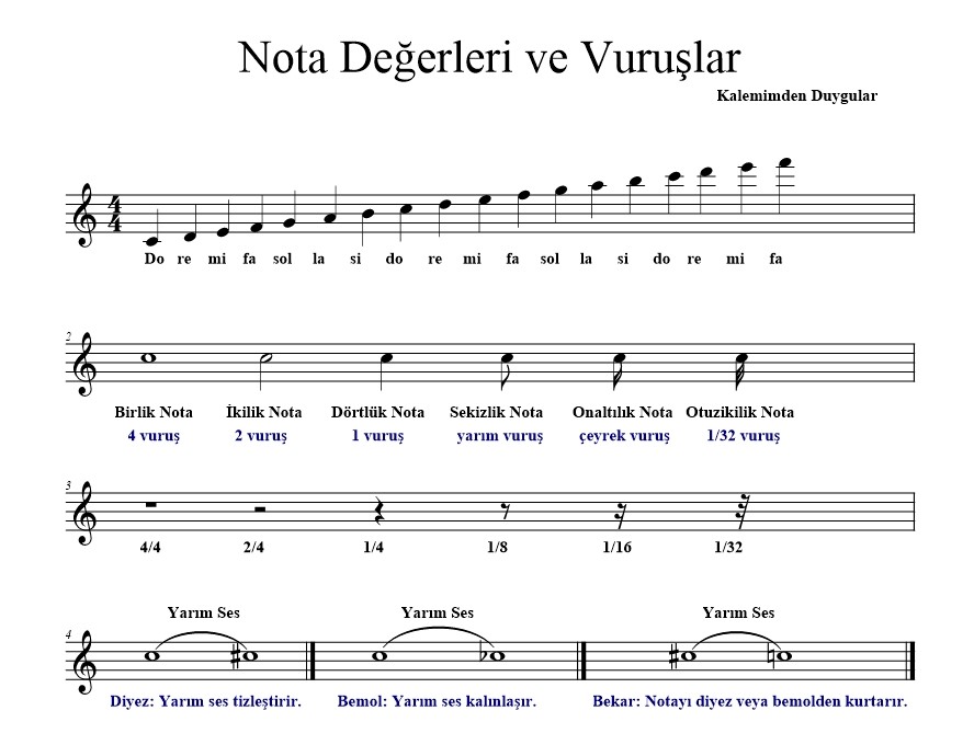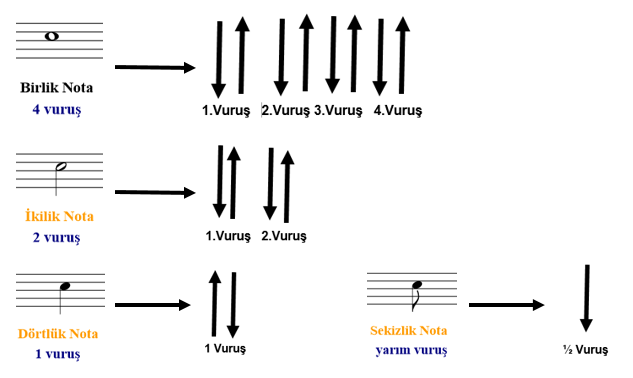 Bir enstrümanı öğrenmeye başlamanın en önemli başlangıcı nota öğrenmektir. Nota bilmemek enstrümanı bir yere kadar çalmanızı sağlar. Eğer her parçayı çalmak ve ilerlemek istiyorsanız nota öğrenmeniz şarttır. Benim size önerim nota öğrenirken çalıştığınız parçada nota isimlerini altlarına yazmayın. Yoksa öğrenmeniz zorlaşır. Aşağıdaki resimde notalar ve kaç vuruş oldukları yazmaktadır. Şimdi size vuruşun ne olduğunu da anlatacağım.