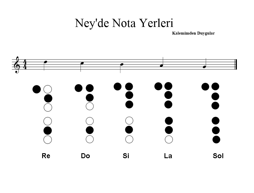Bu aşamaya sesler iyice oturduktan sonra geçin lütfen. Artık Neyinizi elinize aldığınızda sesleri daha güzel çıkarabiliyorsunuz. Bu yüzden sıra notalara geldi. Aşağıdaki resimde notaların Ney’deki yerleri gösteriliyor. Resimde görülen siyah noktalar kapalı olan parmaklarınızı gösteriyor. Üflemek istediğiniz notayı üflemek için parmaklarınızı şekildeki kapalı yerler gibi kapatarak orta şiddette üflemelisiniz. Yani ne çok sert ne de çok yavaş şekilde olmalıdır. Bu kısmı çalışırken resimde görüldüğü sırayla Re’den Sol notasına kadar tek nefeste inilebilmelidir. Daha sonra Sol notasından Re notasına kadar çıkmayı deneyebilirsiniz. Sol notası bu notalar içinde en kalın ve en zor çıkarılan notasıdır. Sol notasını çıkarabilecek düzeye gelene kadar lütfen başka bir çalışmaya geçmeyiniz.