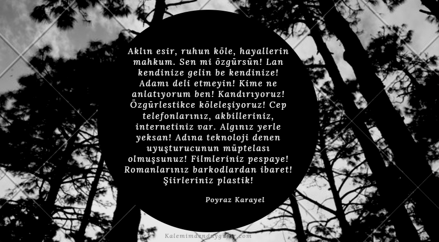 - Aklın esir, ruhun köle, hayallerin mahkum. Sen mi özgürsün! Lan kendinize gelin be kendinize! Adamı deli etmeyin! Kime ne anlatıyorum ben! Kandırıyoruz! Özgürleştikçe köleleşiyoruz! Cep telefonlarınız, akbilleriniz, internetiniz var. Algınız yerle yeksan! Adına teknoloji denen uyuşturucunun müptelası olmuşsunuz! Filmleriniz pespaye! Romanlarınız barkodlardan ibaret! Şiirleriniz plastik!