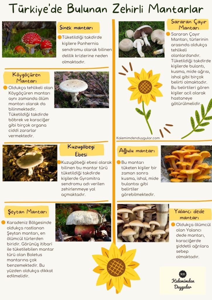 Lezzet açısından oldukça sevilen bitki olan mantar, kişilerin en çok tercih ettiği gıdalar arasında olmaktadır. Mantar içerisinde birçok türe ayrılmaktadır. Bu türler arasında zehirli olanlar da bulunmaktadır. Bu türlerin iyi bir şekilde ayırt edilmesi gereklidir. Aksi takdirde zehirli mantar yiyen kişilerde belirli bir zaman sonra sersemlik, bulanık görme, nabızda artma gibi belirtiler görülebilmektedir. Bu gibi belirtileri gören kişiler en kısa zamanda bir sağlık kuruluşuna gitmelidir.