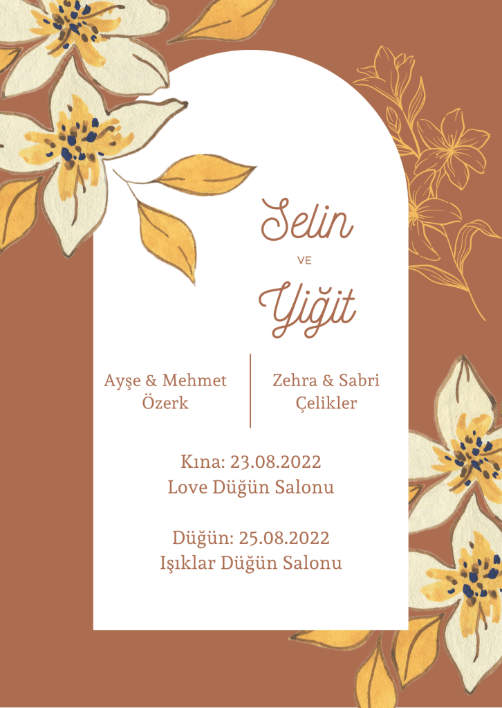 Kahverengi çiçek temalı düğün davetiyesi ile muhteşem bir düğün başlangıcı yapabilirsiniz. Bu tasarımı aşağıdaki link yardımı ile indirebilirsiniz.