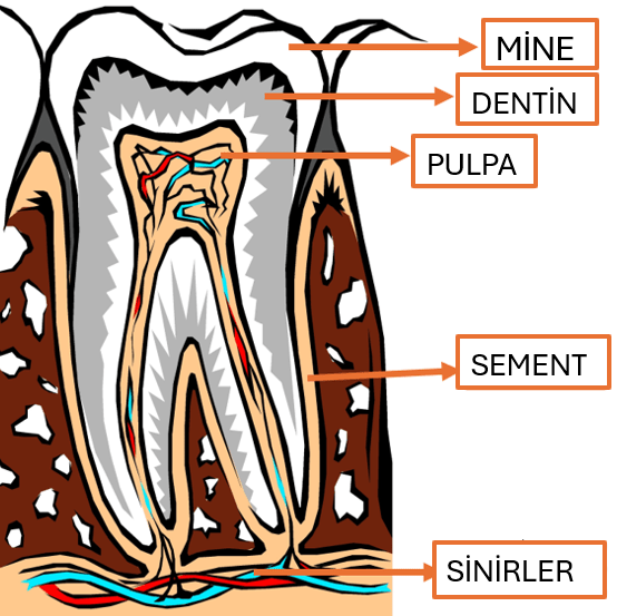 -Mine tabakasının altında bulunan bir diğer sert doku ise dentintir. Dentin, mineye nazaran daha yumuşak olsa da kemik dokularından daha fazla kalsiyum fosfat (%75) ve daha az kolajen (%18) içerdiği için daha sert yapıdadır. Sement tabakası ise dişin kök yüzeyini örten çok ince bir yapıdır. Diş özü olarak isimlendirilen pulpa içerisinde kan damarları ve sinirlerden oluşan yumuşak bir doku yer almaktadır. Bu yapı moleküler antropoloji çalışmalarındaki en önemli kısımdır. (Hacettepe Üniversitesi Sosyal Bilimler Enstitüsü Antropoloji Anabilim Dalı ÇİNE-TEPECİK İNSAN İSKELET KALINTILARININ ARKEOGENOMİK ANALİZİ-2019)