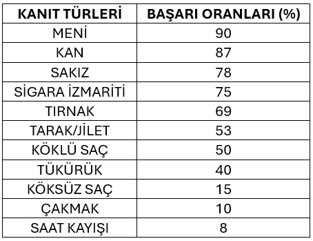 Tablo, Ankara Üniversitesi-Adli Tıp Enstitüsü-DNA Laboratuvarının İşleyişi makalesinden alınmıştır.
