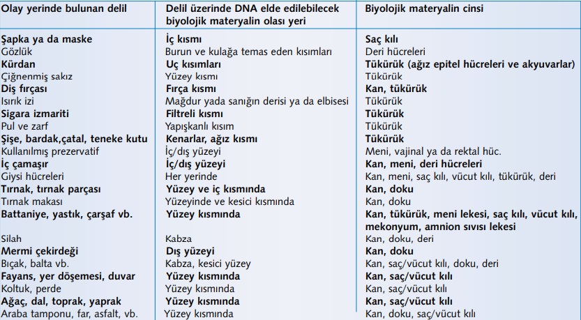 -Olay yerinde bırakılan hemen hemen her türlü materyalde DNA bulunabilir. En çok kan, tükürük, kıl, doku parçası ve meni DNA bulunduran biyolojik materyallerdir. Kısaca; kişilerin kullandığı tüm şahsi eşyalarında DNA bulunabilir. Olay yerinden elde edilen failin kullandığı alet ve malzemelerde el teması nedeniyle DNA bulunabilir. Yine kişisel eşyalar olan diş fırçası, tırnak makası, traş bıçağı vb. malzemelerde olabilir. Özellikle cinsel suçlarda mağdurun tırnak arasındaki epitel deri kalıntıları DNA tespiti için mutlaka değerlendirilmelidir. (International Humanities and Social Science Review-ADLİ OLAYLARDAN ELDE EDİLEN DNA’LARIN FAİLİN TESPİTİ AMAÇLI KULLANILMASINDA YENİ BİR YÖNTEM: DNA FENOTİPLENDİRME)